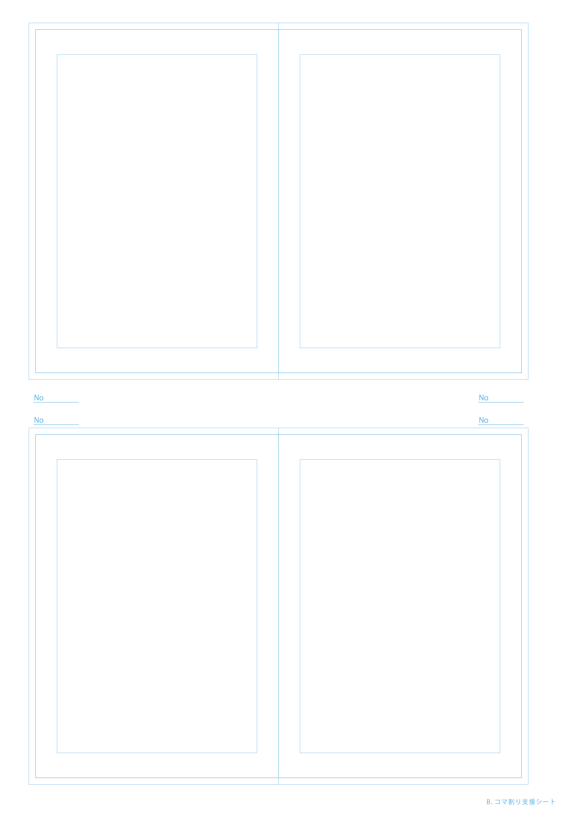 コマ割りとネーム前のラフや、コマを超える大きな文字等、見開きでどう見えるかを大まかに。またそのコマに番号をつけて、次のコマ支援シートである程度細かい内容まで詰める為に使います。番号をつけて行く事で漫画完成までに何コマ描けばいいかも把握出来るはず。